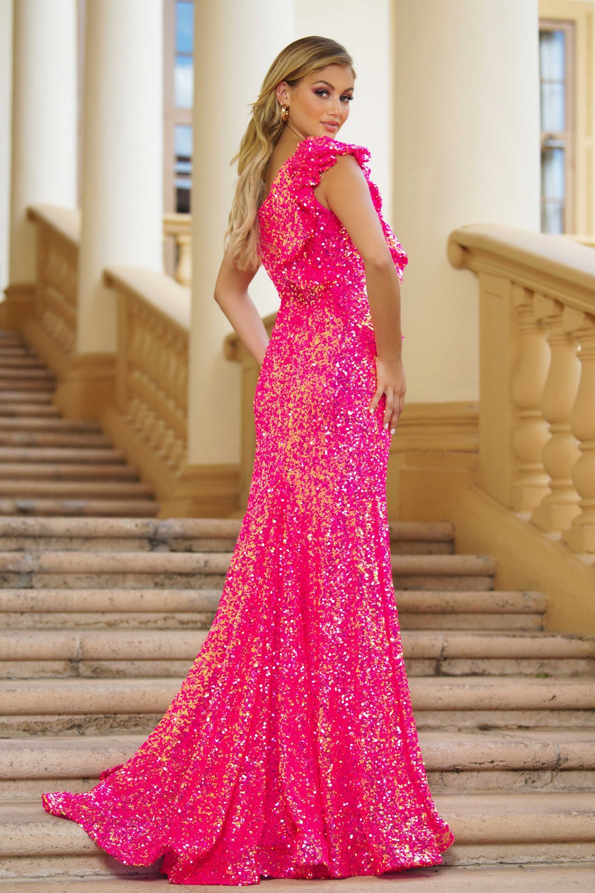 This eye-catching gown dazzles with all-over sequins and a stylish one-shoulder design, perfect for making a grand entrance. The thigh-high slit adds a touch of allure to this glamorous look. Ava Presley Style 39280 ensures you’ll shine bright at any event.