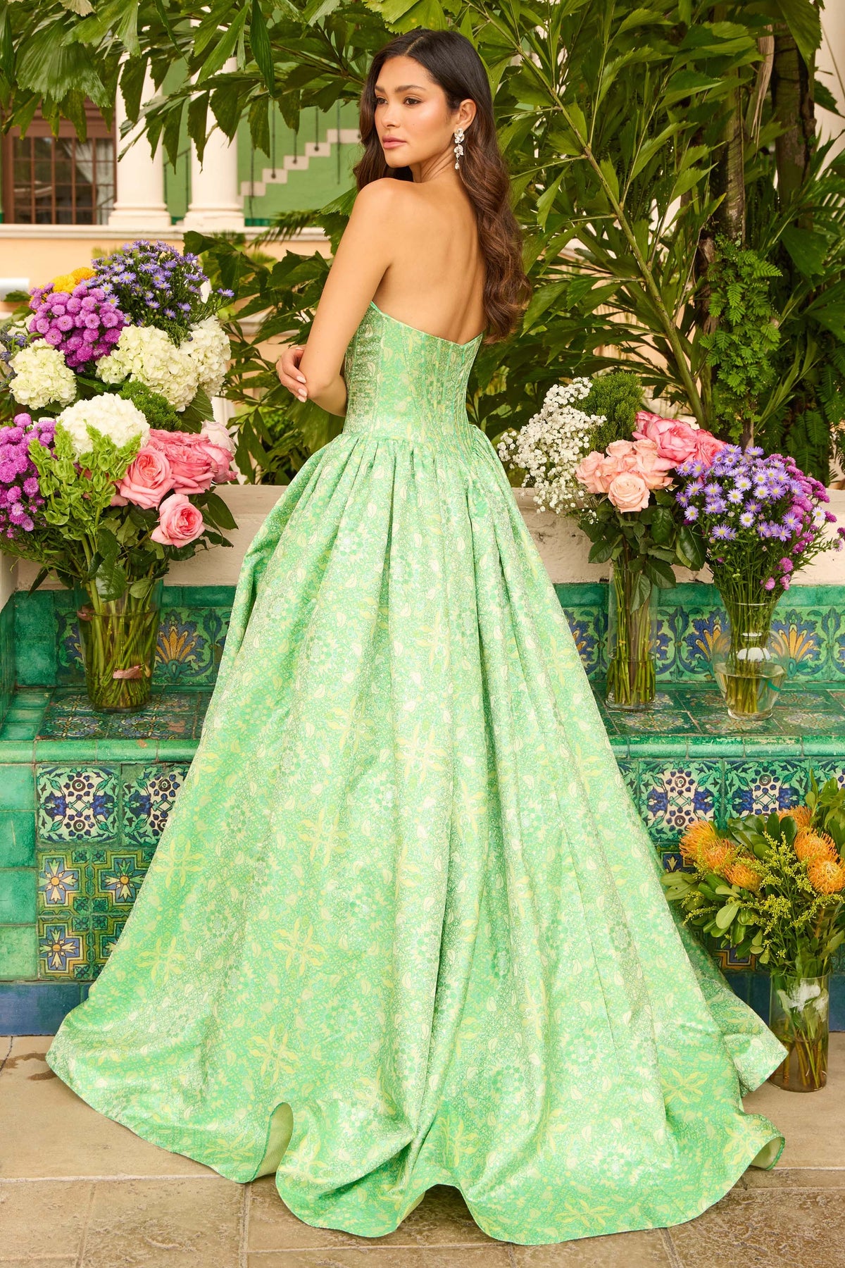 Ava Presley 42318 makes a statement with its luxurious metallic jacquard fabric and bold thigh-high slit, blending elegance with runway-inspired edge. The fitted bodice with sweetheart neckline and detailed beading draws attention to the waist, while the full skirt adds grandeur and volume. This is the ultimate gown for a standout prom night or gala appearance.
