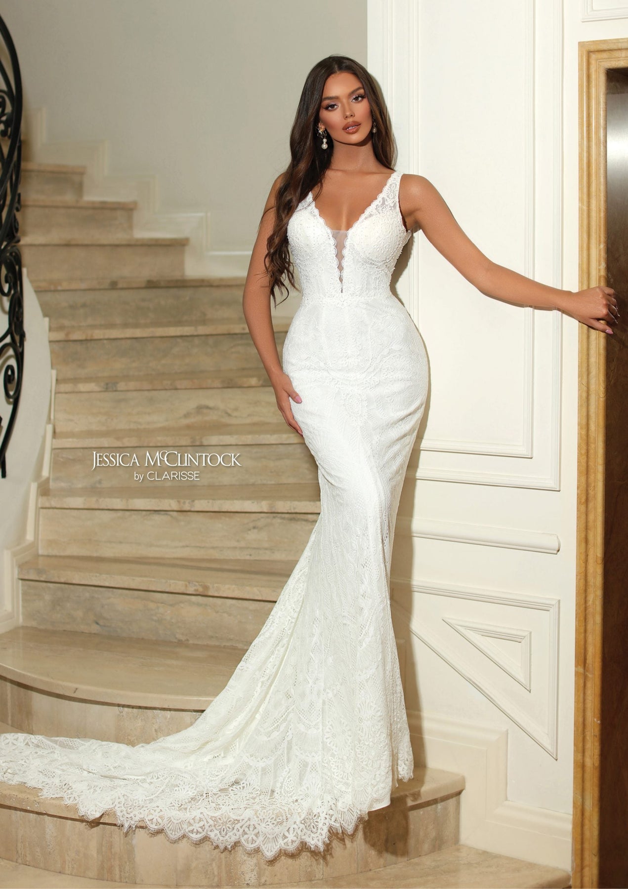 Make a chic and timeless statement in this fit and flare wedding gown. Embroidered lace adds texture and elegance, while the deep plunge V-neckline and open back with a sweeping scalloped train offer a romantic and glamorous look. Belt sold separately.
