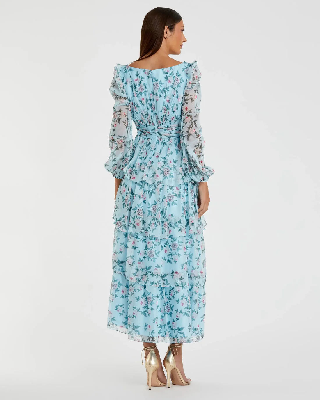 This elegant midi dress features long chiffon sleeves and a thigh-high slit, enhanced by tiered ruffle accents. Crafted from floral-printed chiffon and fully lined for comfort, it showcases a V-neckline with a wrapped bodice design. The semi-sheer sleeves and back zipper complete the refined look. This pretty floral dress embodies romantic sophisticated charm.