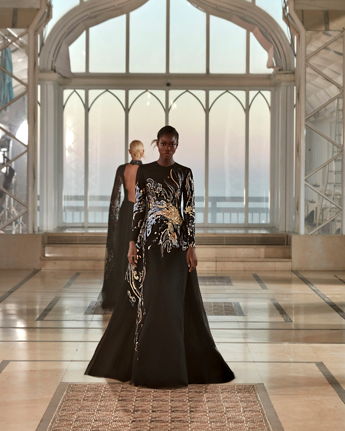 The Edward Arsouni 1102 Dress is a stunning couture piece that embodies luxury and sophistication. This exquisite long dress features elegant long sleeves and a distinctive half neck design that frames the face beautifully. The open back creates a dramatic, fashion-forward silhouette that's perfect for making an unforgettable entrance at formal events. Crafted with a touch of sequins throughout the fabric, this gown catches light with every movement, adding glamour and dimension to your look. The special design details showcase impeccable tailoring and attention to detail that defines true couture craftsmanship. Ideal for galas, red carpet events, or any occasion where you want to feel absolutely radiant and confident.