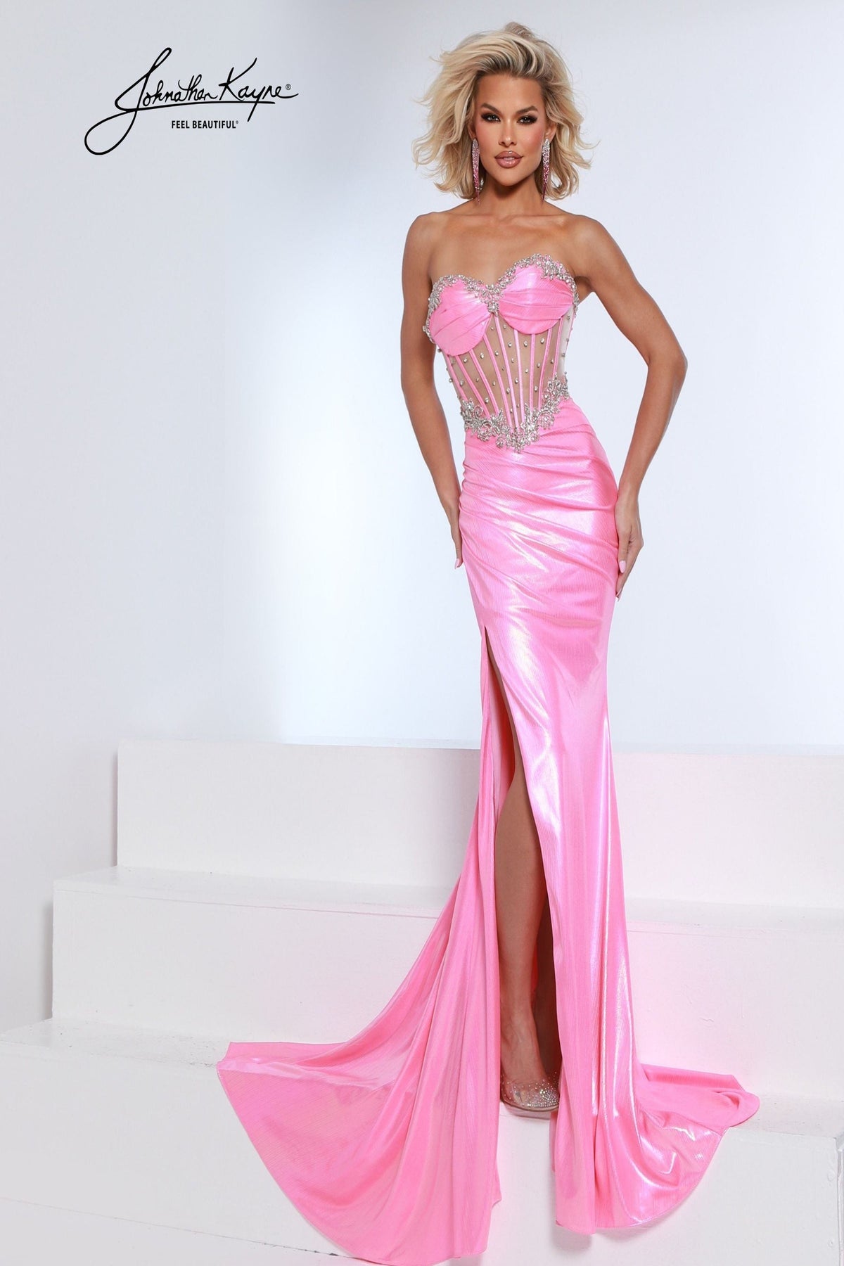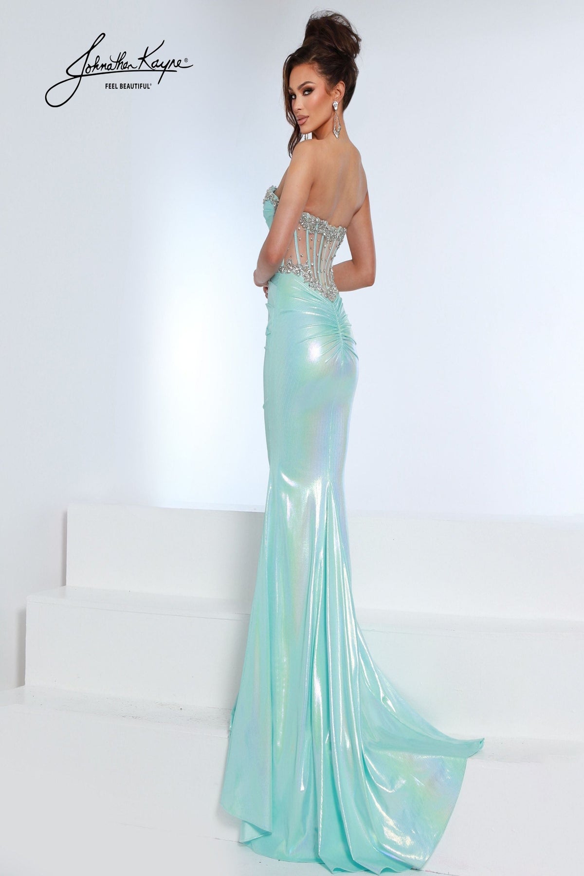 Johnathan Kayne 3233 Dress Turn heads at your next special occasion in this stunning strapless gown that captures light beautifully. The iridescent jersey fabric creates a mesmerizing shimmer with every movement, while delicate crystals adorning the sweetheart neckline add an elegant touch of glamour. The sheer corset bodice provides flattering structure and sophistication, and the graceful side slit offers both comfort and a hint of allure. Whether you're heading to prom or a formal event, this dress empowers you to feel confident, radiant, and unforgettable.