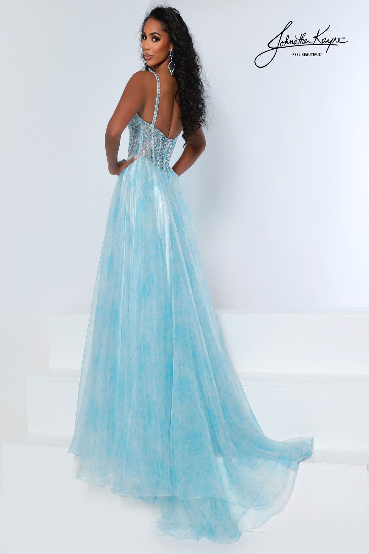 Make a statement in this stunning Johnathan Kayne 3269 ballgown, crafted from dreamy printed poly organza that catches every light. The crystal-embellished exposed boning bodice creates a show-stopping silhouette, while the plunging neckline and defined waist flatter your figure beautifully. A daring slit adds movement and confidence to every step. Perfect for red-carpet moments, prom nights, or any occasion where you deserve to shine with pure sparkle and elegance.