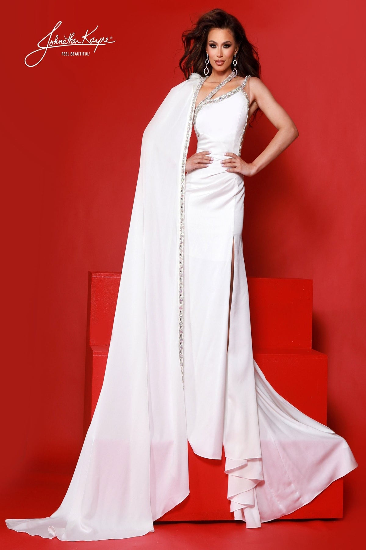 Turn heads in this stunning Johnathan Kayne gown designed for showstopping moments. Sparkling crystal-trimmed edges catch the light with every movement, while a daring thigh-high slit adds modern edge. The dramatic detachable cape drapes elegantly over one shoulder for instant glamour and versatility. With a daringly open back, this gown commands attention on the pageant stage or red carpet. Perfect for those ready to make an unforgettable entrance and own the spotlight.