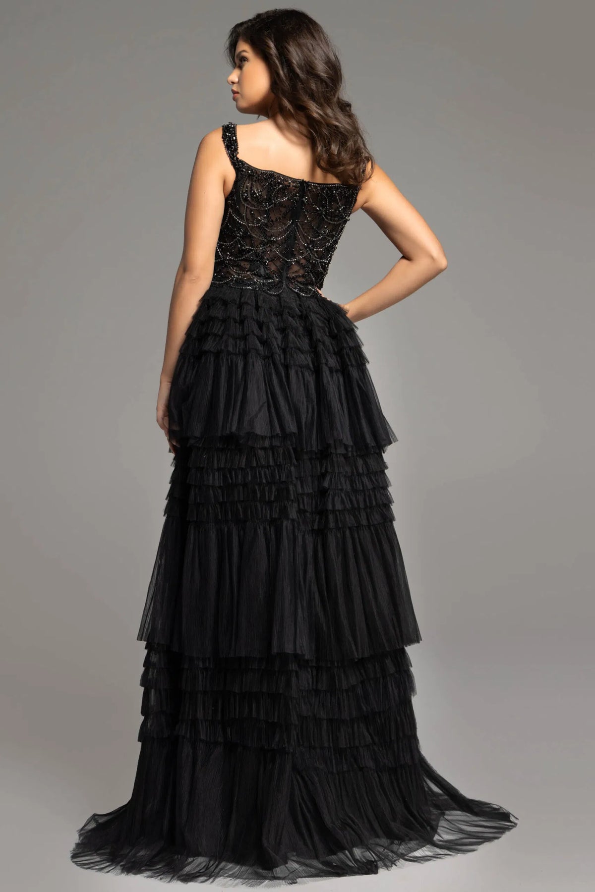 Step into the spotlight in the Jovani 37438, a show-stopping prom gown that's pure magic. This tulle ballgown features a beaded illusion bodice that sparkles with intricate detail, commanding attention from every angle. The layered skirt flows gracefully to the floor with a chic slit for effortless movement, blending timeless elegance with modern flair. Whether you're dancing the night away or making your grand entrance, this dress delivers the drama, sophistication, and unforgettable glamour your prom night deserves.