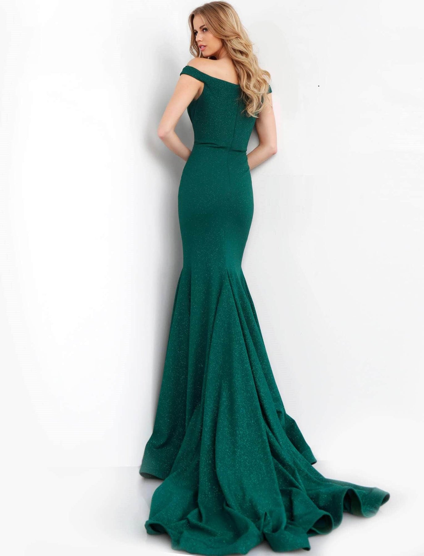 Radiate sophistication like the star-speckled night sky in this ethereal Jovani 55187 creation. Beautifully tailored in a glittering stretch fabric that molds the female form like a glove, this beauty shows off an off-shoulder neckline with an alluring v-shaped notch and a mid-open back. The svelte mermaid skirt flutes before it magnificently flares from knees to feet for a liquid finish and a lush court train. Hit the runway in a striking style in this fashion forward Jovani masterpiece. Model is wearing the Hunter color.