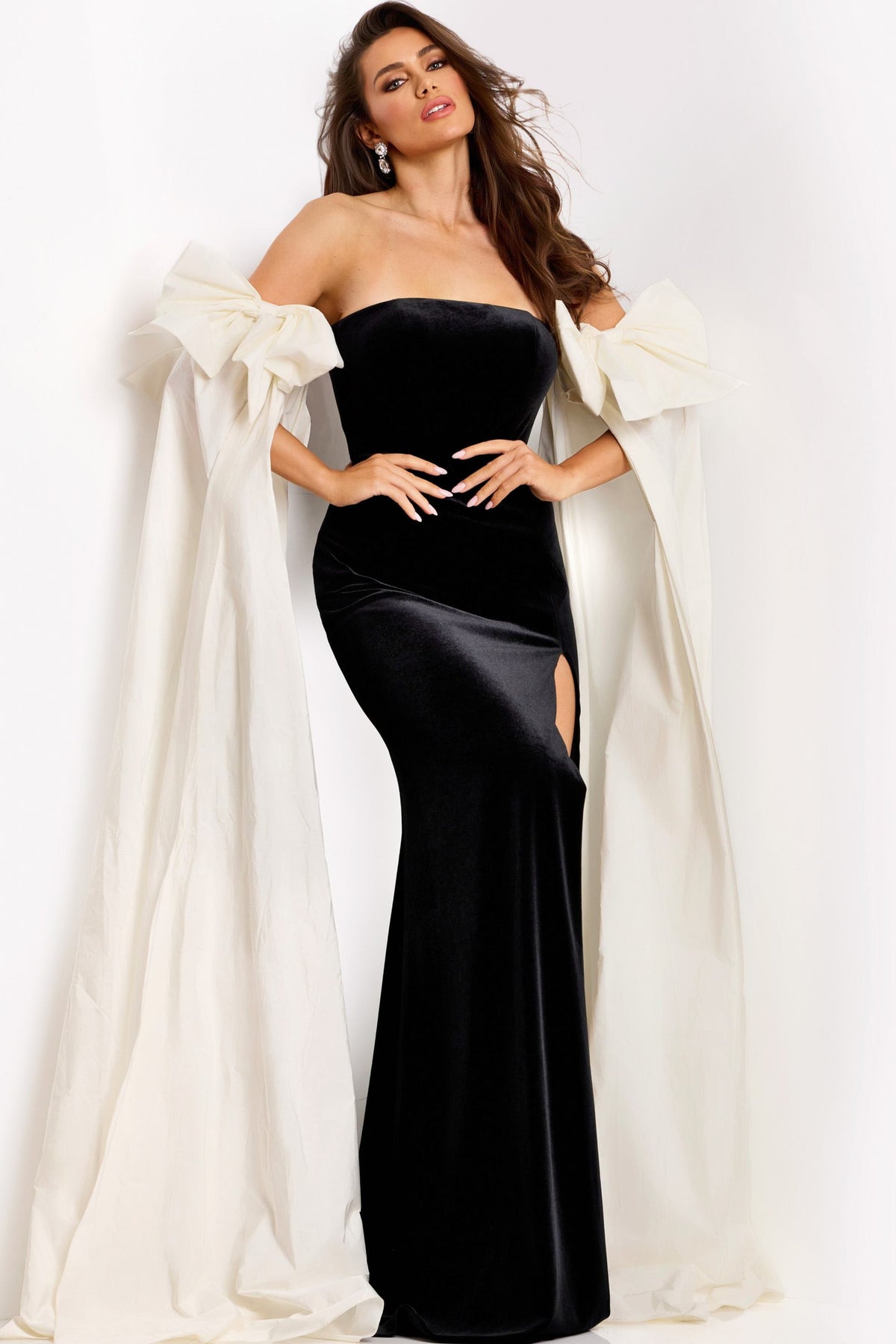 Make a statement in this stunning Jovani 42970 gown, designed to turn heads at any formal occasion. The strapless, fitted silhouette hugs your curves beautifully, while the luxurious velvet fabric drapes elegantly to the floor. A dramatic high slit adds movement and allure, and the detachable cape with oversized bows offers versatile styling options—wear it for added glamour or remove it for a sleeker look. The closed back features a secure zipper for a polished finish, and the structured taffeta cape provides dimension and sophistication. Sleeveless and effortlessly chic, this gown celebrates your confidence and elegance.