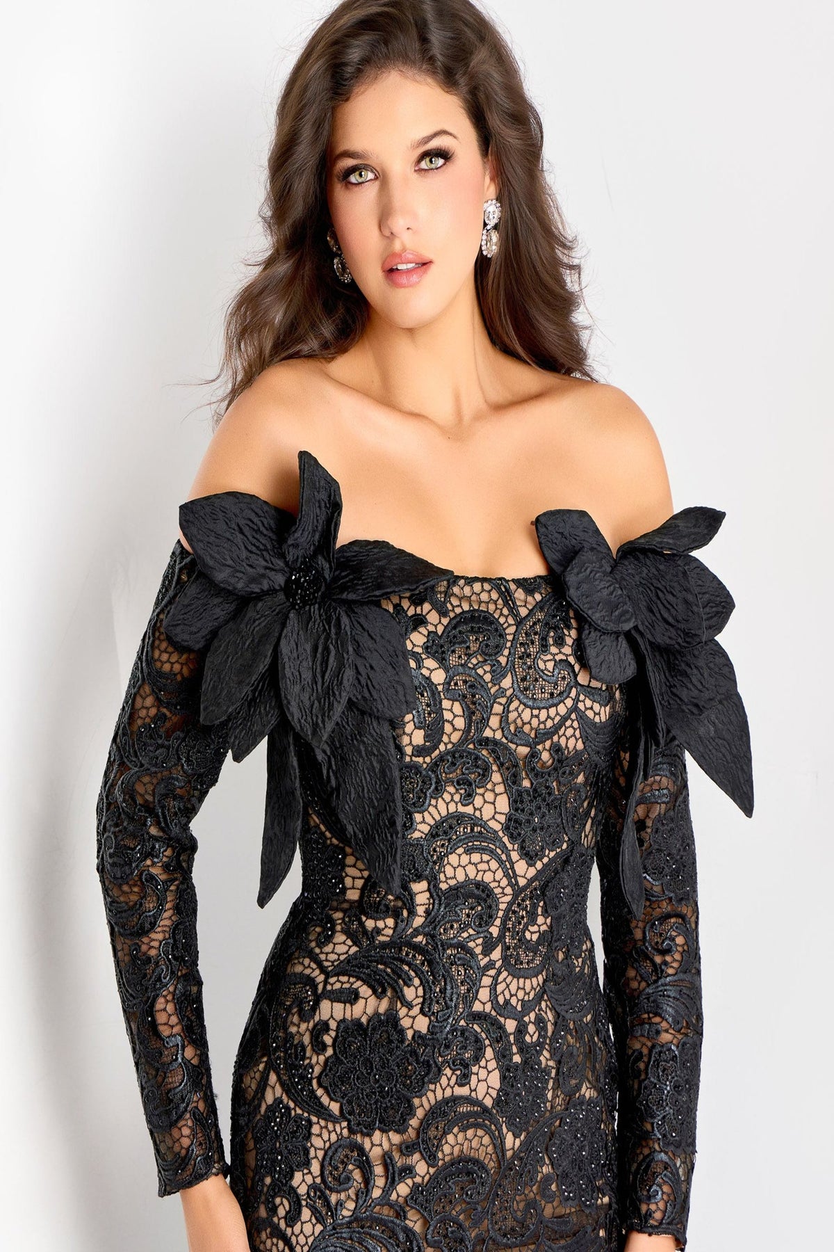 Elevate your evening with the stunning Jovani 45345 Dress, a show-stopping mermaid gown designed to make you feel confident and radiant. The elegant off-the-shoulder neckline frames your shoulders beautifully, while sheer long sleeves with delicate scalloped edges add romantic sophistication. Crafted from luxurious lace with nude lining, this floor-length dress features intricate appliqué detailing and a charming satin bow accent that draws the eye. The fitted mermaid silhouette flatters your curves, and the convenient zipper back ensures a seamless fit. Perfect for proms, galas, or any special occasion where you want to shine with grace and elegance.