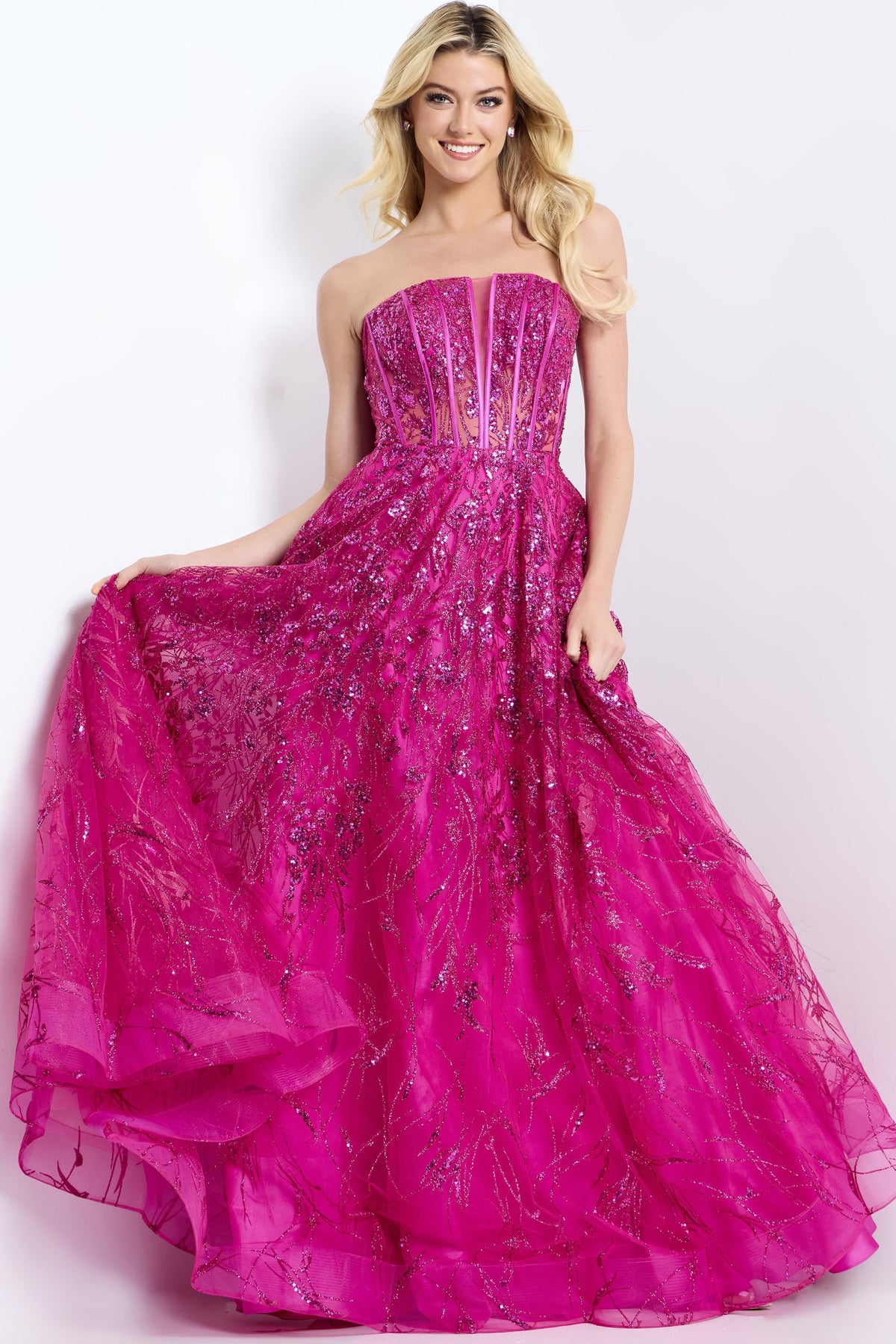 Make a stunning entrance in this Jovani 45913 dress, designed to turn heads at any formal occasion. The strapless straight-across neckline and fitted corset bodice create an elegant silhouette, while the A-line skirt flows gracefully to the floor. Shimmering sequin tulle catches the light with every movement, enhanced by delicate shimmer embellishments throughout. The fitted waist accentuates your curves beautifully, and the dramatic open back features an oversized bow accent that adds a touch of glamour and sophistication. Perfect for galas, or special events where you want to feel confident and radiant.