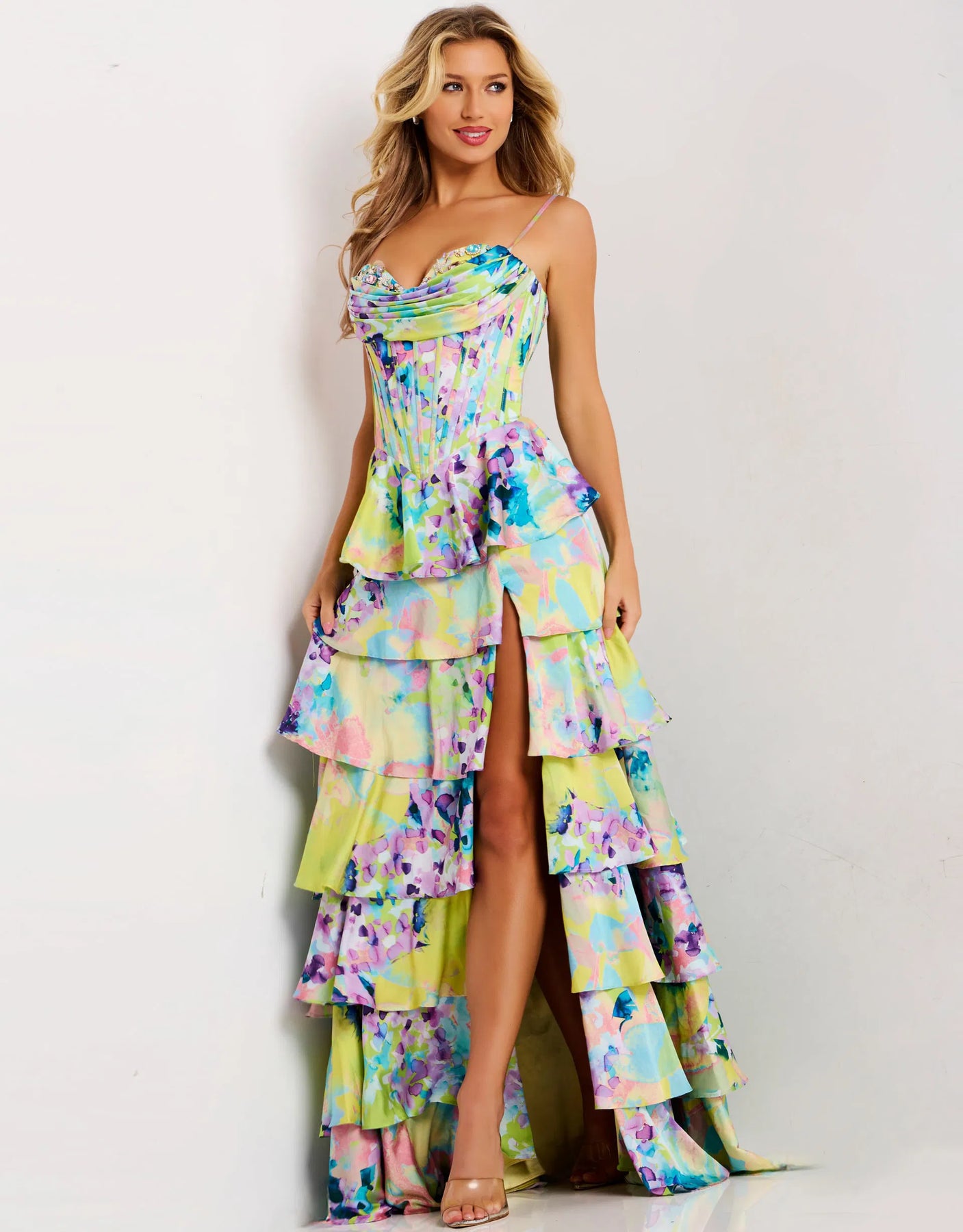 The Jovani 47560 Dress features a tiered floral print gown with a structured corset bodice, designed to enhance your silhouette beautifully. Its layered skirt adds movement and elegance, perfect for making a graceful entrance at any special event. This dress combines classic femininity with a flattering fit, supporting your confidence with every step.