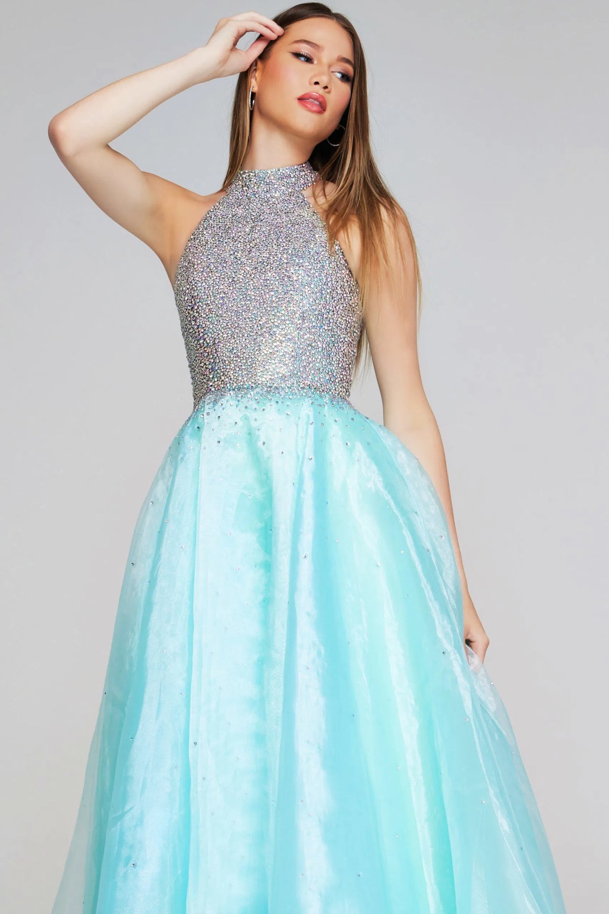 Be the belle of the ball in this Jovani K38262 Dress! The light turquoise color and intricate beading make this halter ball gown a showstopper. Perfect for prom or any special occasion, this dress will have you feeling like a true princess. Get ready to dance the night away!