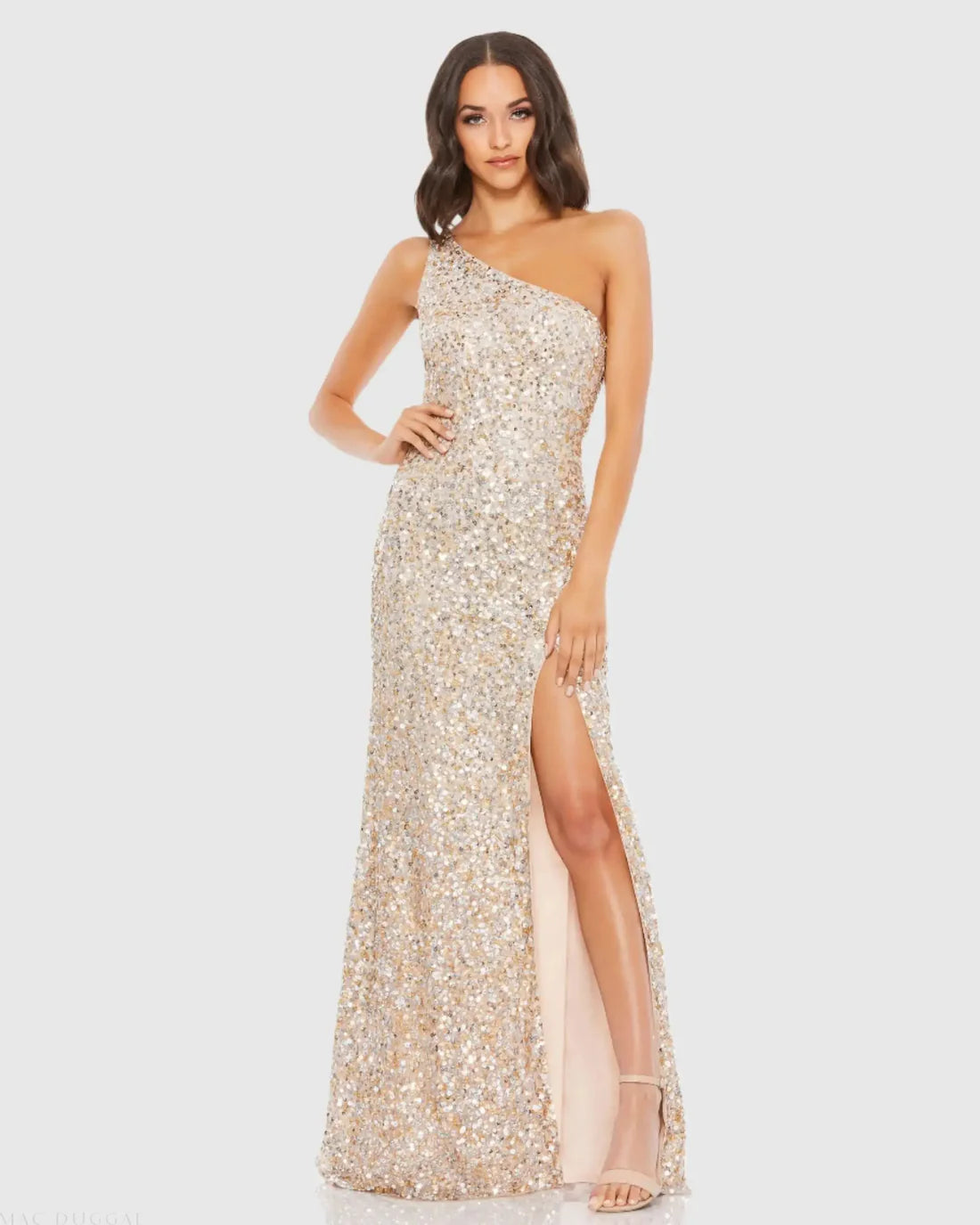This gorgeous sequined gown features a one-shoulder neckline and sleeveless design for a sleek and modern look. The thigh-high slit adds a touch of glamour to the fitted silhouette. Made with sequin fabric, this gown is perfect for any special occasion.