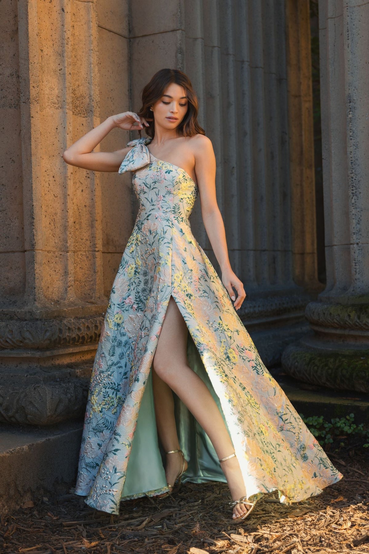 Crafted from brocade fabric, this stunning gown features an exaggerated bow at the shoulder for a touch of dramatic flair. The sleeveless one shoulder neckline adds a modern and elegant touch, while the allover brocade detailing elevates the look.