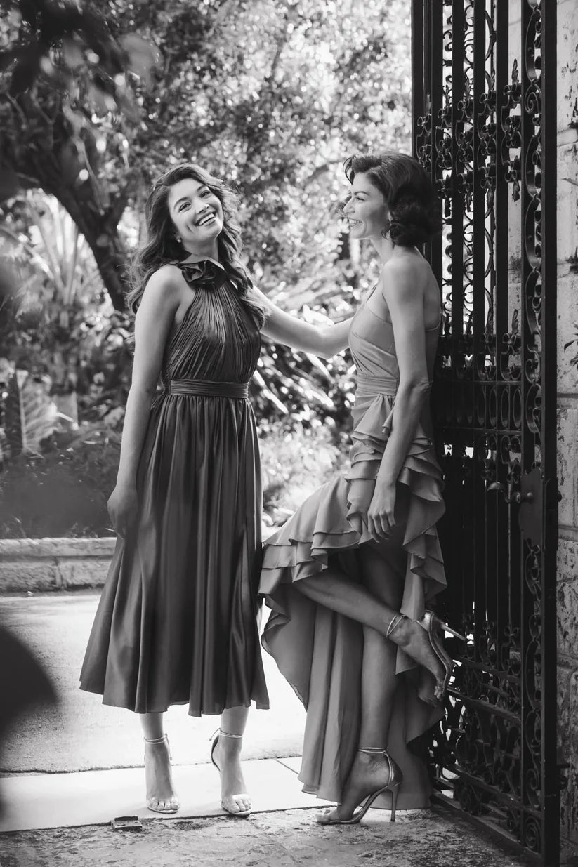 Crafted from luxurious charmeuse fabric, this charming midi dress is perfect for any special occasion. The high neckline is adorned with a delicate rosette, while the pleated bodice adds texture and dimension, creating a flattering and stylish silhouette.