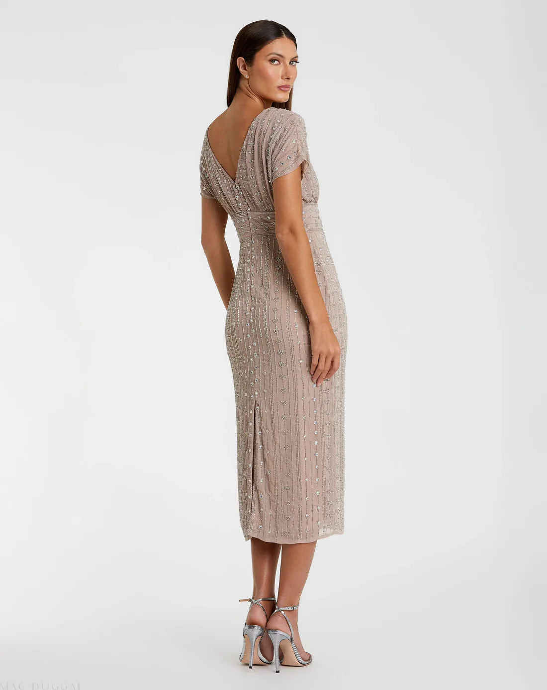 Turn heads at summer outdoor weddings and cocktail events in our Beaded Cap Sleeve Sheath Dress. With intricate embellishments, it exudes effortless elegance and seasonal charm.