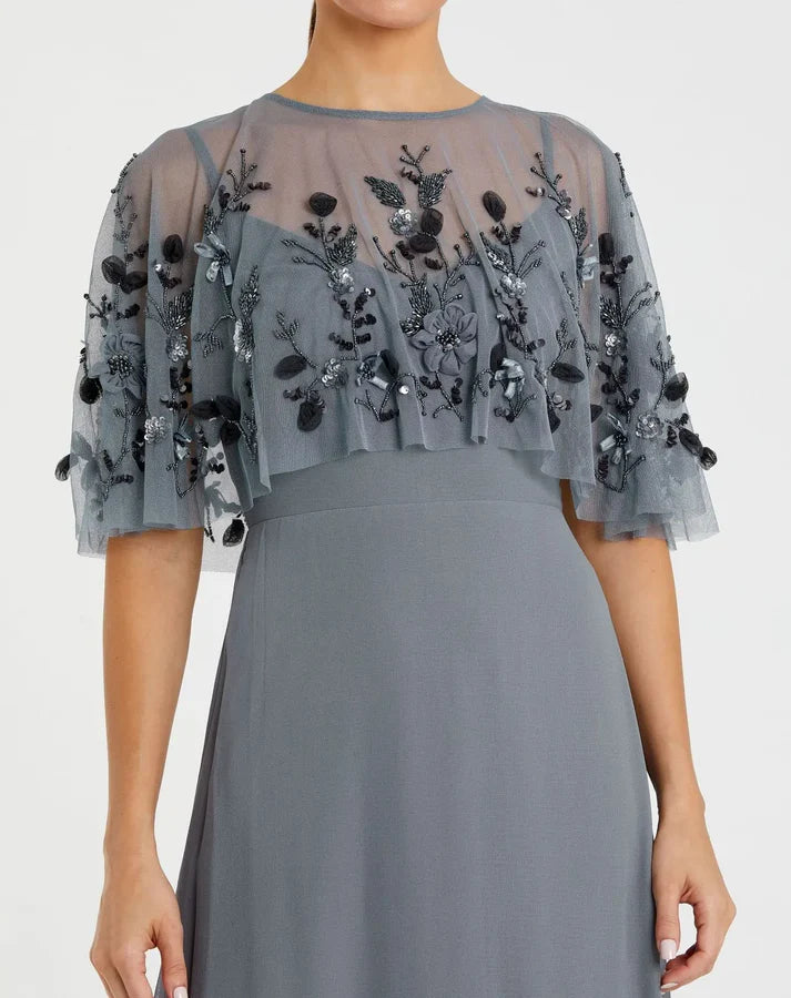 Make a statement in our Sleeveless Gown With Embellished Cape, a striking choice for your next formal affair. Featuring a sleeveless design and a flowing cape adorned with embellishments, this gown exudes elegance and drama.