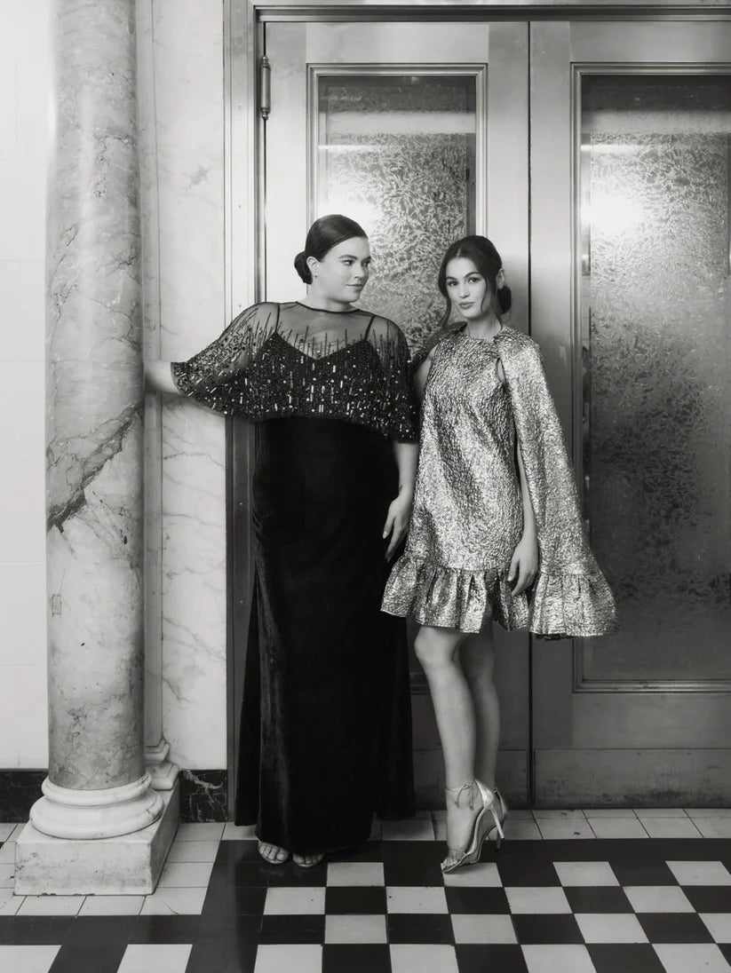 • Mesh cape sleeves with intricate hand embellishments