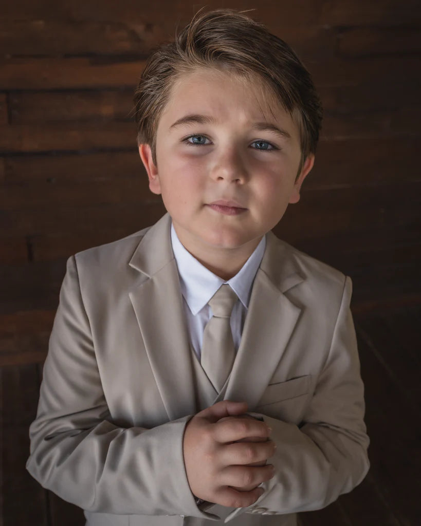 Introduce your little one to timeless elegance with the Peanut Butter Collection 007 Sand Suit. Crafted from a premium polyester-rayon blend, this tailored slim-fit ensemble delivers sophistication without sacrificing comfort. Perfect for ring bearers, weddings, and formal occasions, the complete four-piece set includes a jacket, pants, vest, crisp white shirt, and coordinating long tie. Every detail is designed to make your child feel confident and dapper, ensuring they look absolutely polished from head to toe.