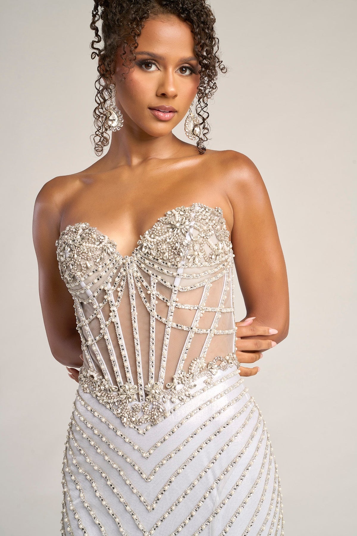 Make a statement in the Portia & Scarlett XO057, a stunning strapless gown that combines architectural elegance with captivating glamour. The sheer corset bodice features exposed boning and intricate beadwork that catches every light, while cascading linear embellishments flow down the fitted skirt to beautifully elongate your silhouette. A daring thigh-high slit adds movement and allure, while the lace-up back ensures a personalized fit that supports and flatters. Perfect for those unforgettable moments when you want to feel confident, radiant, and absolutely breathtaking.