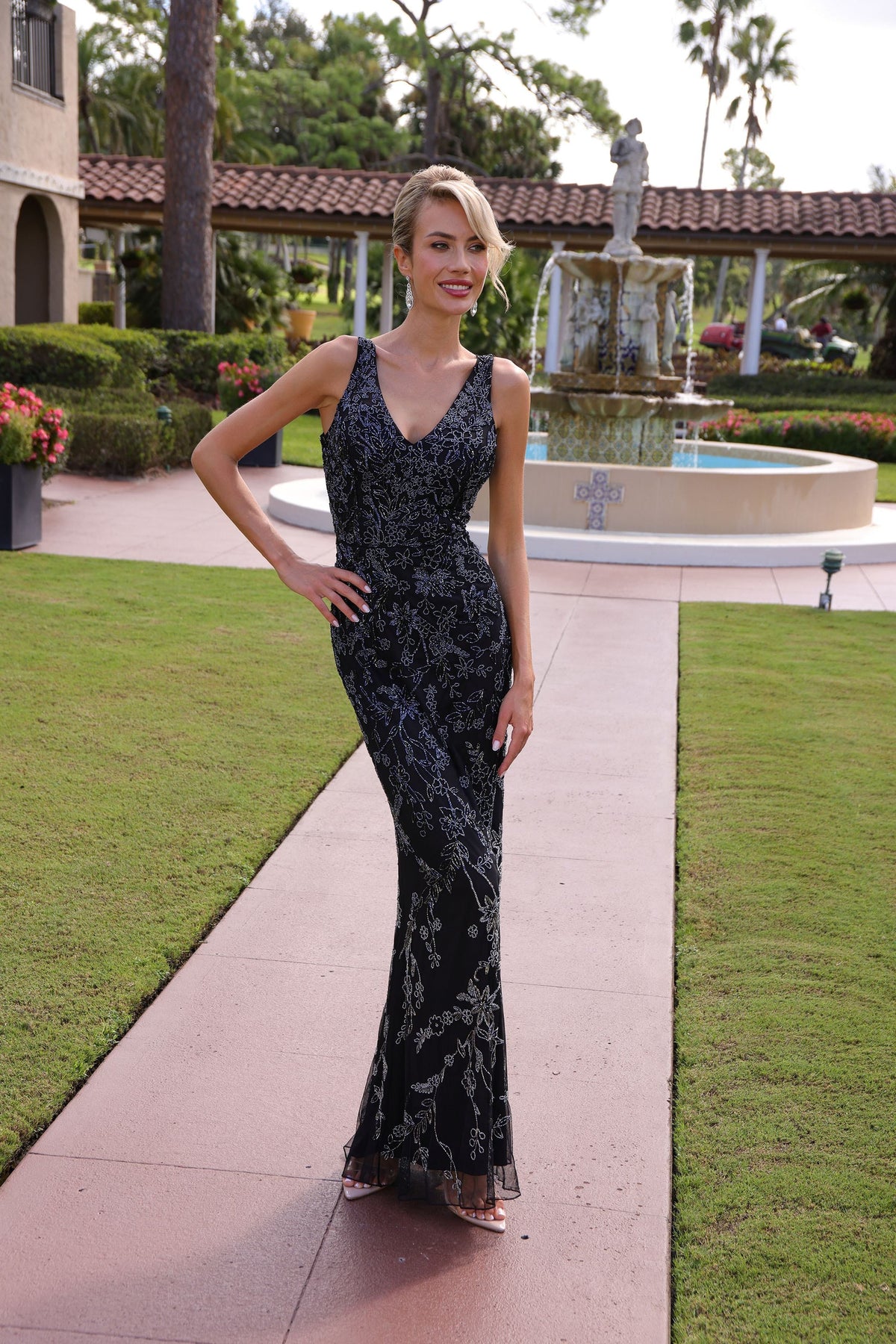 Radiate timeless elegance in this stunning mother-of-the-bride gown. The flattering V-neckline and fitted silhouette create a refined, sophisticated look, while intricate beading cascades across the entire dress in a mesmerizing shimmer. Perfect for celebrating your daughter's special day with grace and confidence, this Primavera design ensures you'll feel as beautiful as you look.