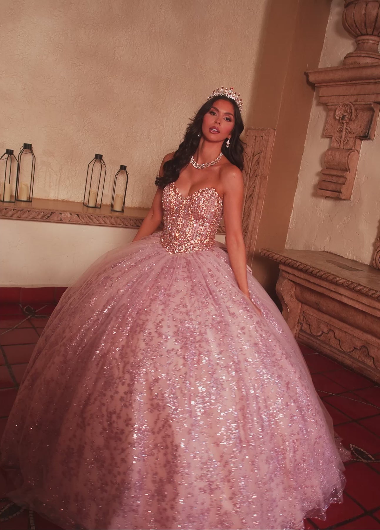 Step into the spotlight with the Rachel Allan RQ1160 Dress, where a voluminous tulle skirt sparkles with shimmering sequins at every twirl. The beaded bodice and sweetheart neckline create a flattering, feminine shape, while a detachable bow adds a fun, elegant twist. Perfect for quinceañeras or grand celebrations, this dress guarantees a magical, unforgettable entrance. Feel like royalty and dance the night away in this dazzling gown!