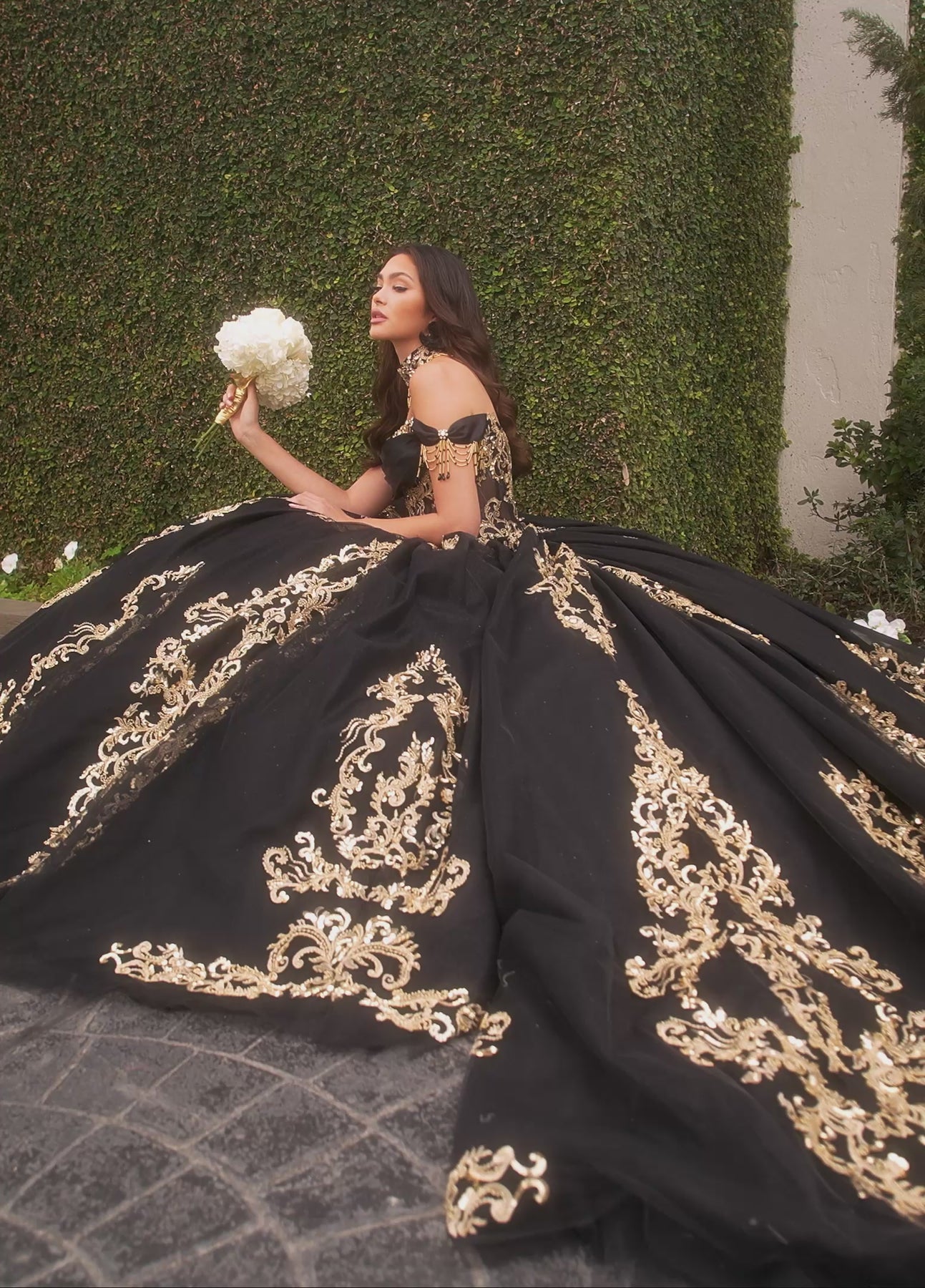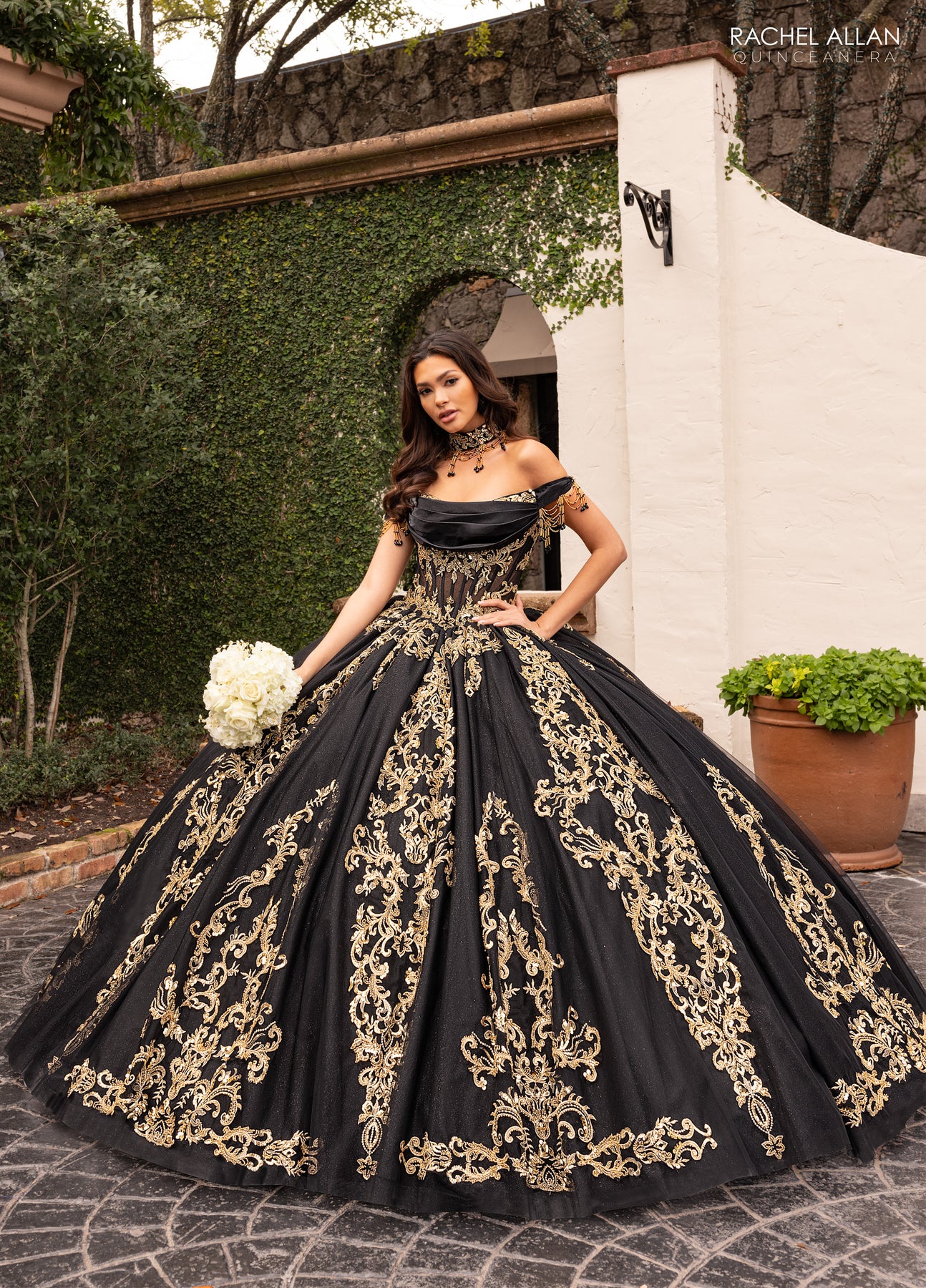 Step into a fairy tale with the Rachel Allan RQ2230 Dress, available in dazzling Black Gold, Navy Silver, or Silver Rose Gold. This gown sparkles with regal applique and crystal satin over layers of glittery tulle, promising a show-stopping entrance. With a detachable necklace and bodice liner, you can switch up your look to keep the magic alive all night long—just perfect for your quinceañera’s unforgettable grand reveal!