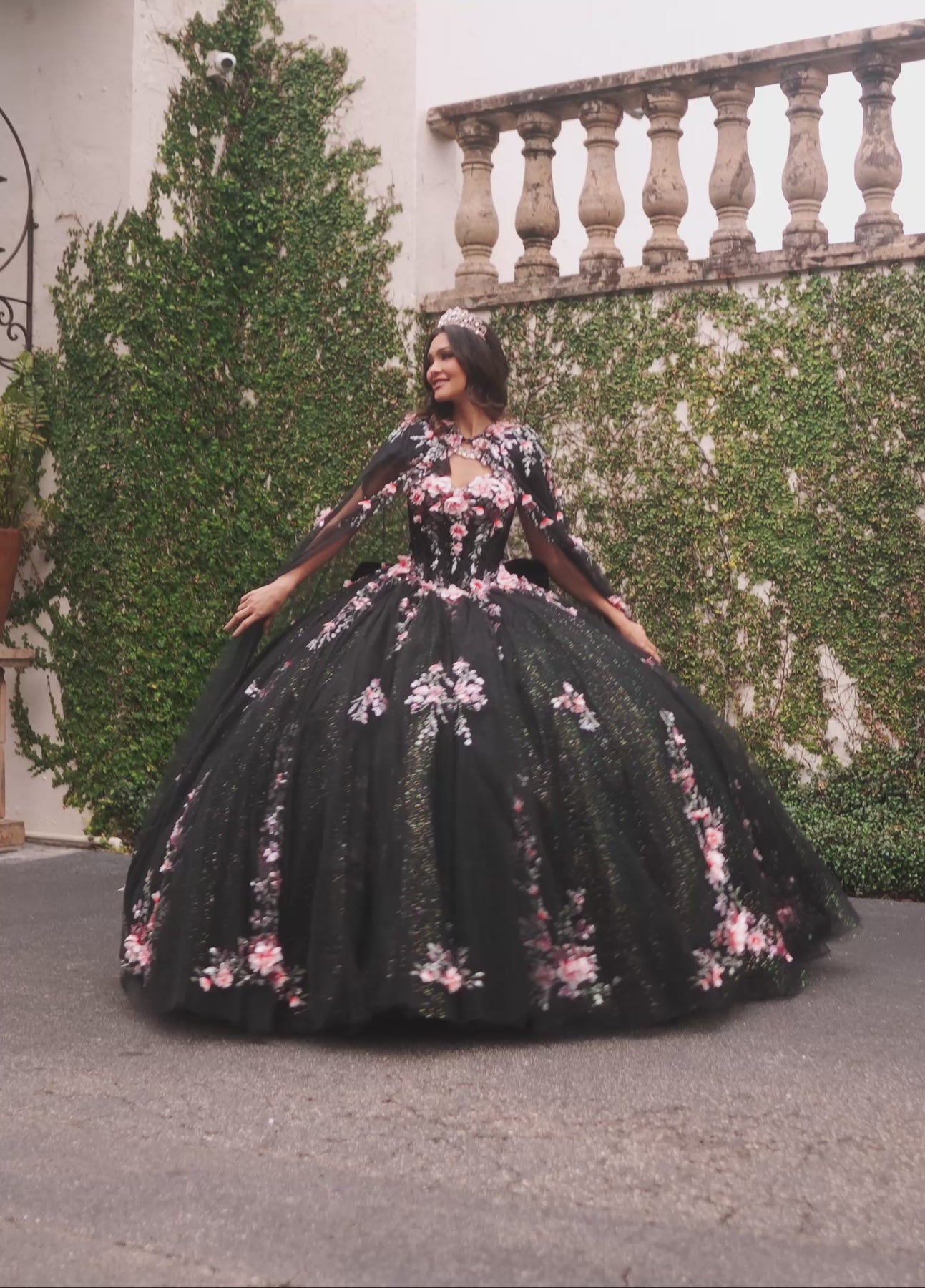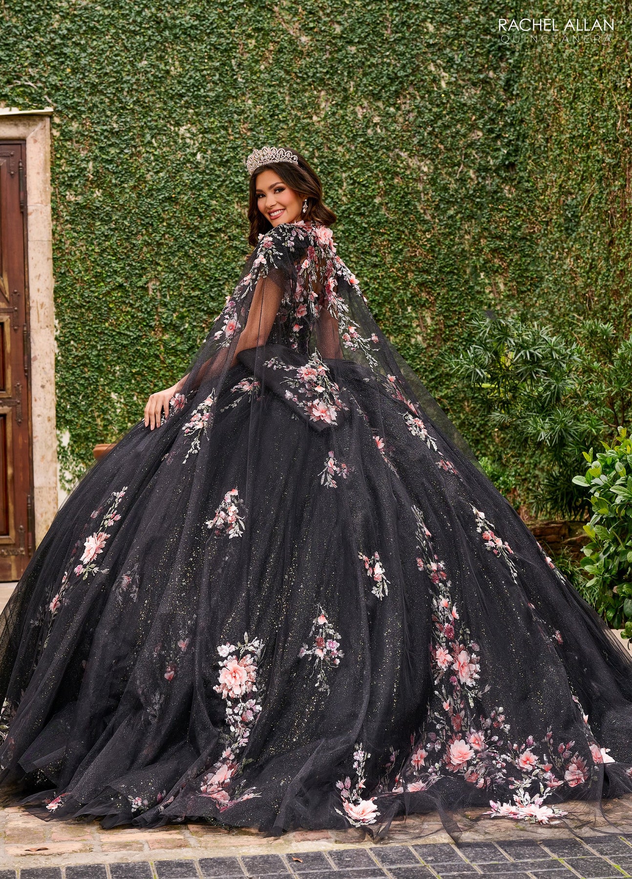 Say YES to your quinceañera in this enchanting Rachel Allan RQ3132 dress. Featuring a soft, dreamy hue with vibrant floral appliqués, this gown brings fairy tales to life. The fitted bodice with a high neckline pairs beautifully with a sheer overlay and a regal cape (sold separately) for an extra magical touch. Twirl with flair in the voluminous skirt with a detachable bow that spreads out like a dream. Perfect for making every moment memorable and playful.