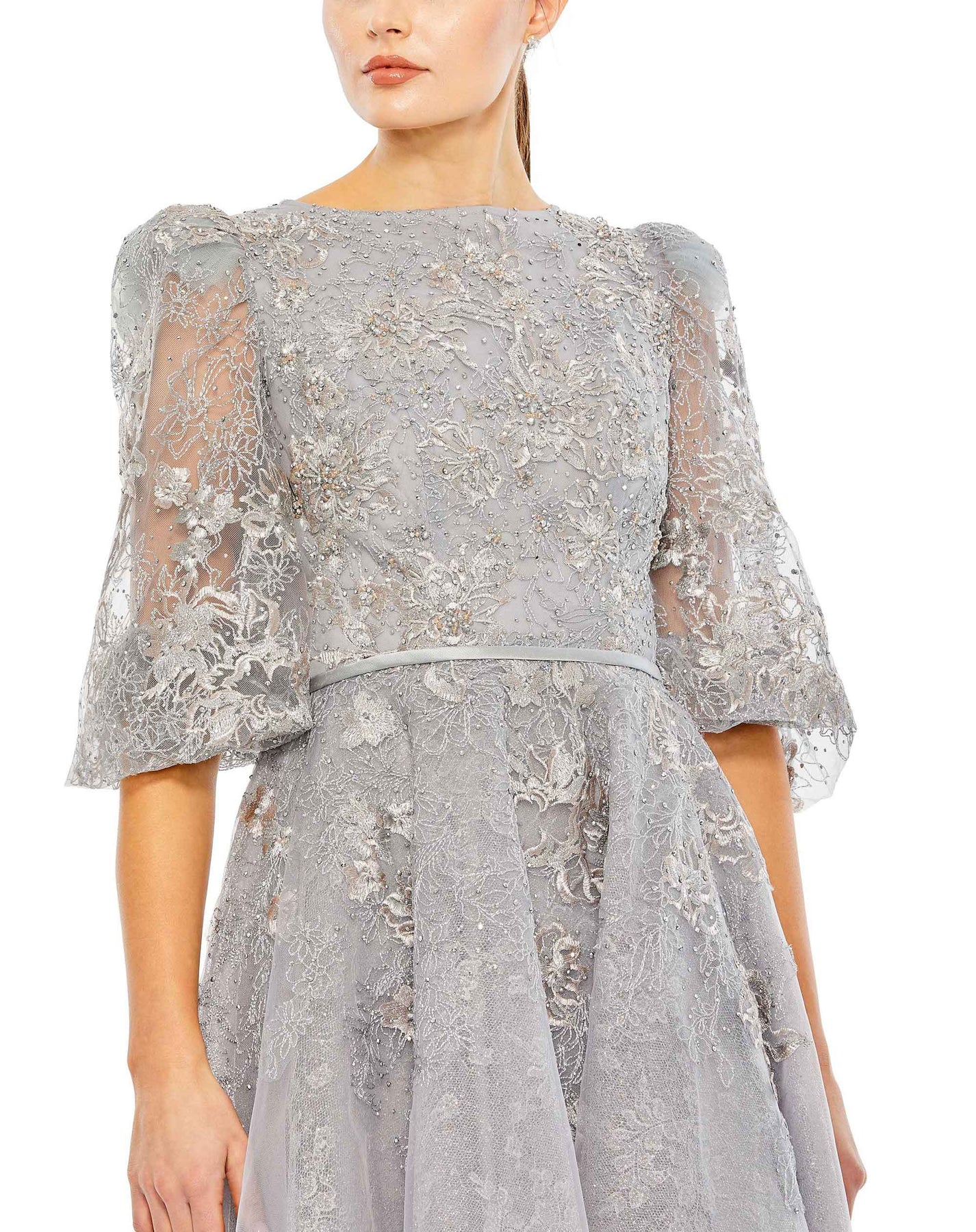 - Fully lined through bodice and skirt; sheer unlined sleeves