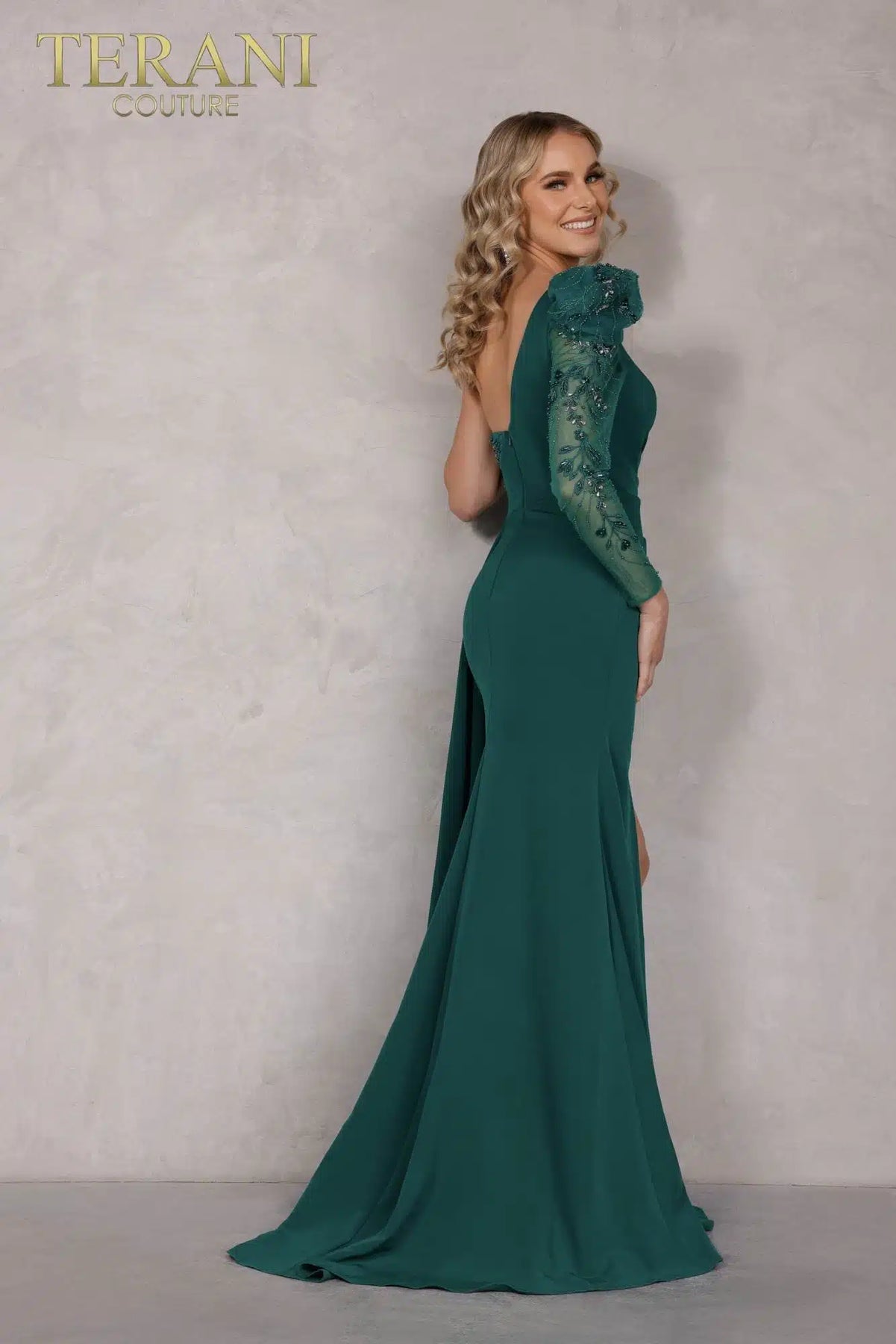This Red Mermaid Evening Dress by Terani features an asymmetrical single long sleeve sweetheart neckline slit dress and an opulent side train. We present Terani Couture’s brand-new, luxurious Fall 2022 collection gown.