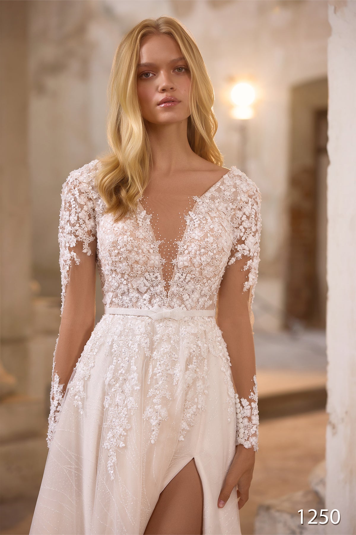 The Vissaria 1250 Dress is an elegant long dress designed to make you feel confident and beautiful. Featuring a flattering V-neckline and flowing long sleeves, this sophisticated style offers both grace and comfort. The high slit adds a touch of modern allure while maintaining timeless elegance. Perfect for brides seeking a dress that combines classic romance with contemporary flair, this piece celebrates your special moment with refined style and movement.