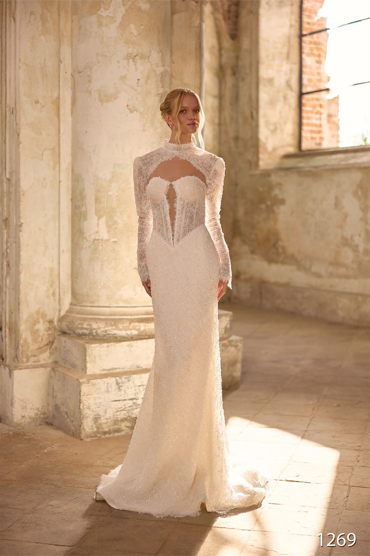 The Vissaria 1269 Dress is a stunning bridal choice that combines timeless elegance with modern sophistication. This exquisite gown features a romantic sweetheart neckline that beautifully frames the shoulders, paired with graceful long sleeves that add an air of refined femininity. The high neckline detail creates a striking contrast, offering both coverage and visual interest for a truly memorable look. Crafted as a full-length dress, this piece provides the flowing silhouette every bride dreams of, making it perfect for creating those magical wedding day moments. Whether you're walking down the aisle or celebrating your special day, this dress delivers the grace, comfort, and beauty you deserve.