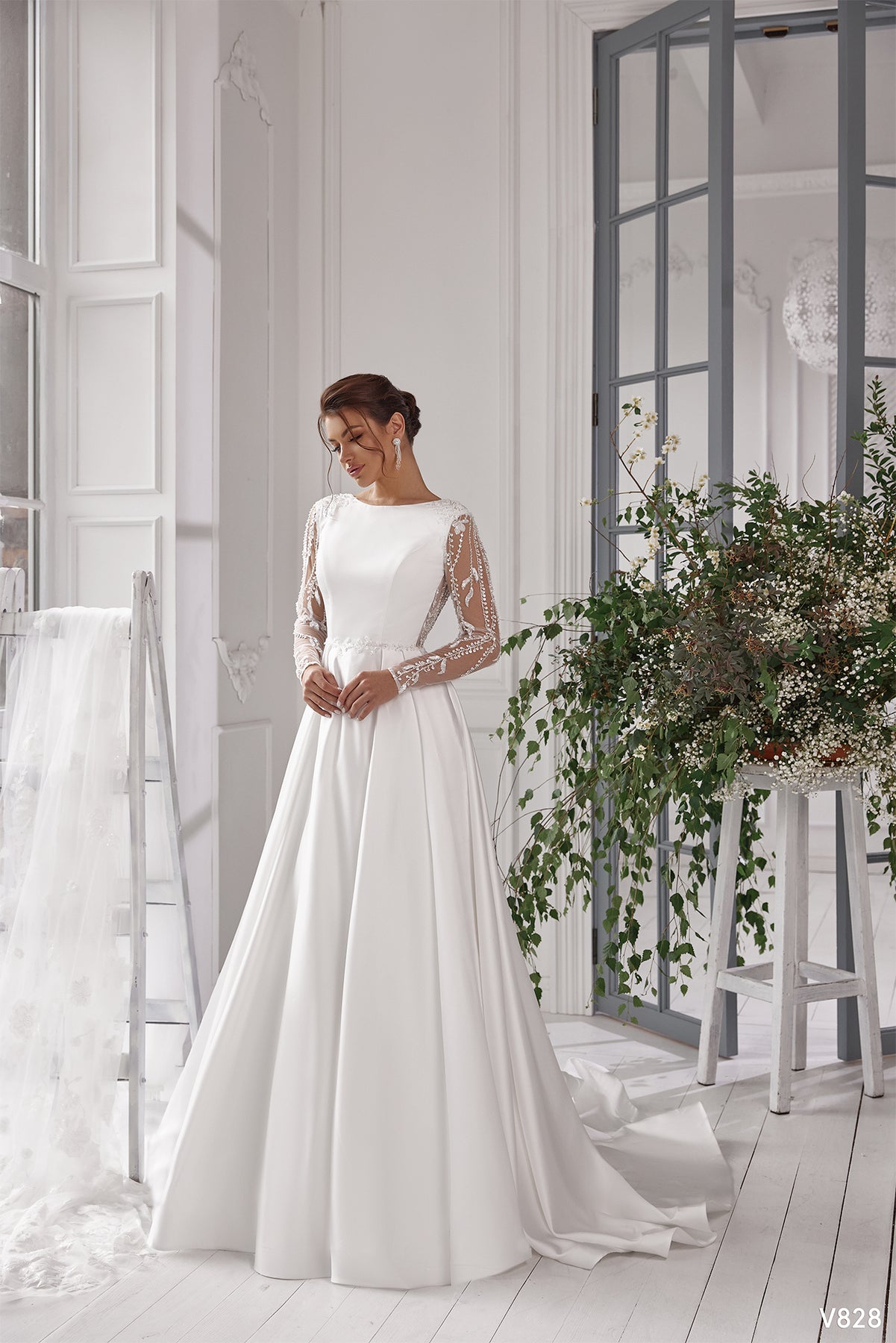 The Vissaria 828 Dress is an elegant bridal gown designed to make your special day unforgettable. This stunning ball gown features a graceful straight across neckline that beautifully frames the shoulders, paired with romantic long sleeves for timeless sophistication. The voluminous skirt creates a dramatic, fairy-tale silhouette that commands attention as you walk down the aisle. Crafted with meticulous attention to detail, this dress celebrates your beauty and confidence on your most important day. Perfect for the bride who envisions a classic, romantic wedding look with modern elegance.